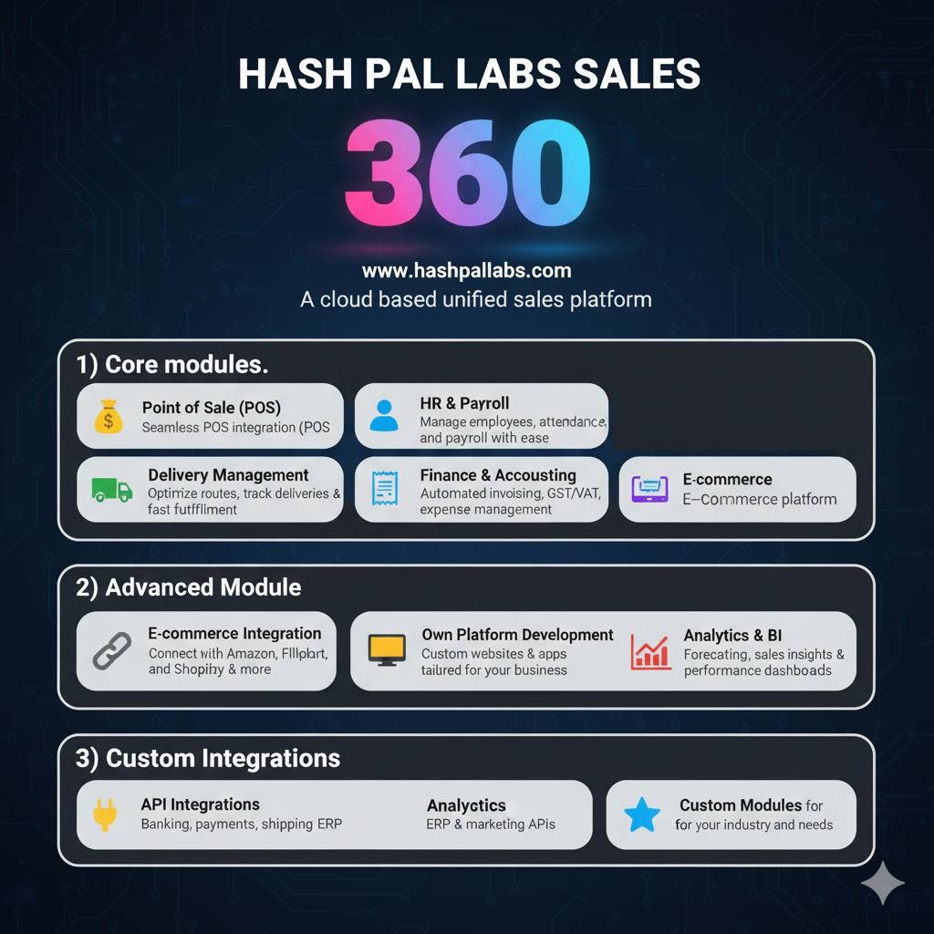 Our flagship product is the Sales 360 Platform, a comprehensive, privacy-first solution designed to power sales and marketing for your enterprise, restaurant, grocery store, small business, e-commerce shop, logistics operation, HRMS service, or general service provider, helping your team grow efficiently and securely.